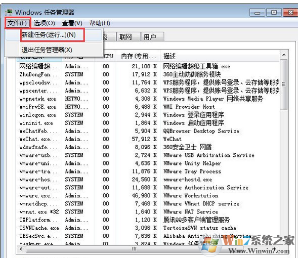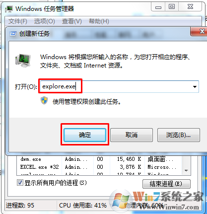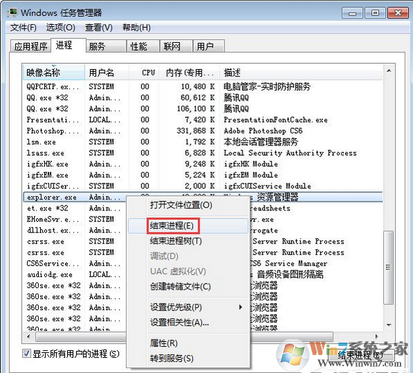 1、ctrl+Shift+Esc打开Win7任务管理器,结束explore.exe进程。
