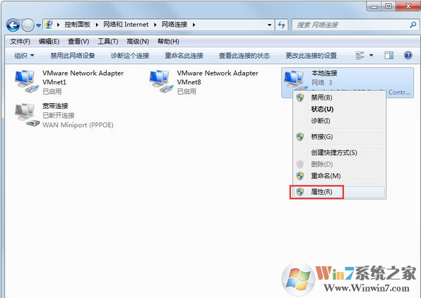 3、右击“本地连接”,从弹出的菜单中选择“属性”项;