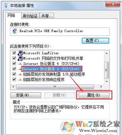 4、接着选中“TCP/IP”项,并点击“属性”按钮;