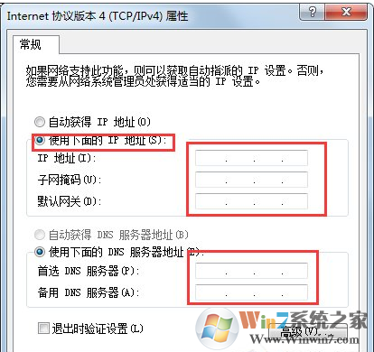 5、在打开的窗口中,勾选“手动设置IP地址”和“手动设置DNS”项,并进行设置。然后就可以正常上网啦。对于DNS的获取方法,请查看下面的内容。