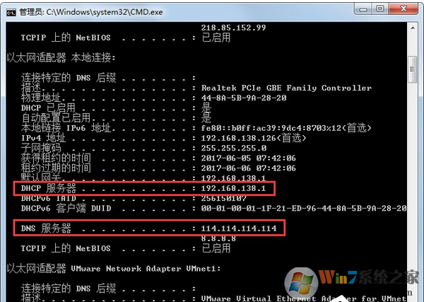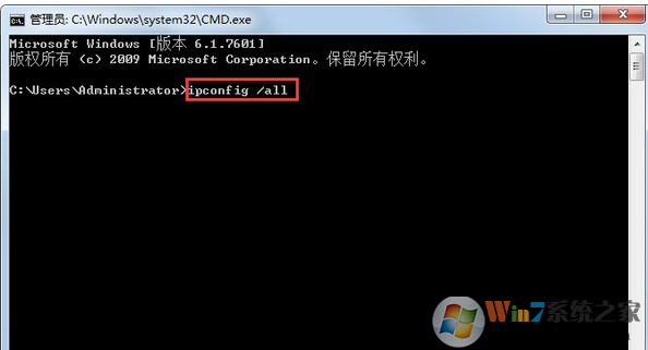 2、在打开的MSDOS界面输入“ipconfig /all”即可查看至“网关地址”和“DNS服务器地址”。