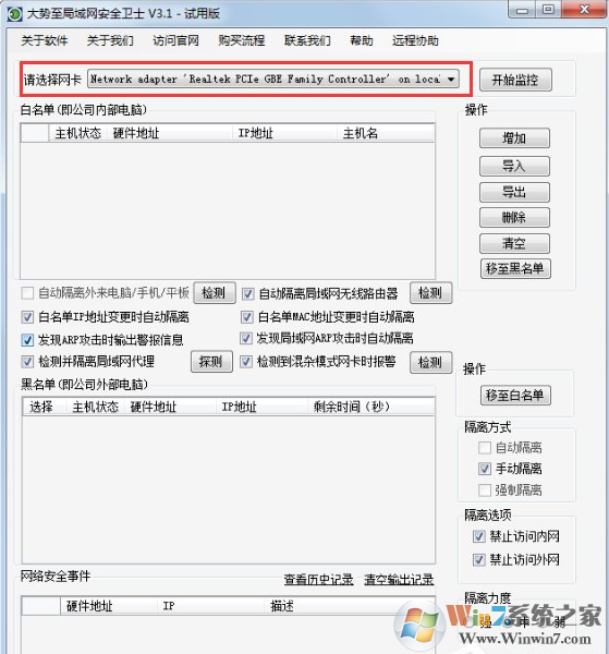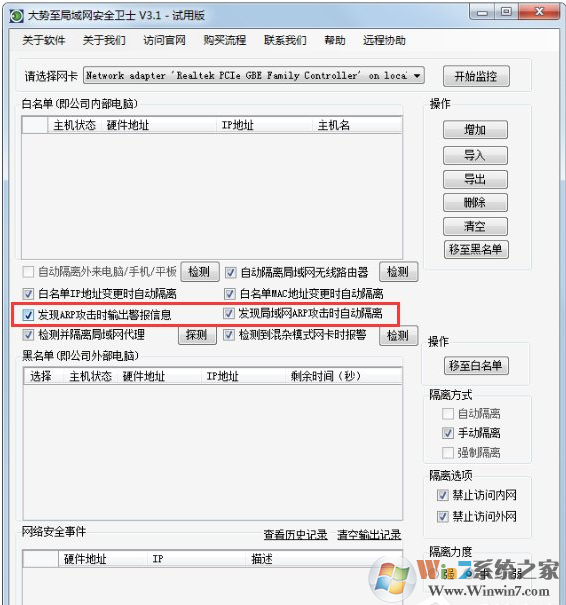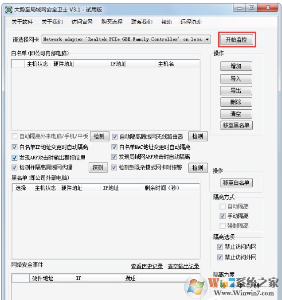 4、最后点击“开始监控”按钮即可。这样,当局域网中存在ARP攻击时会自动隔离并输出报警信号,从而有效保护网络的正常畅通。