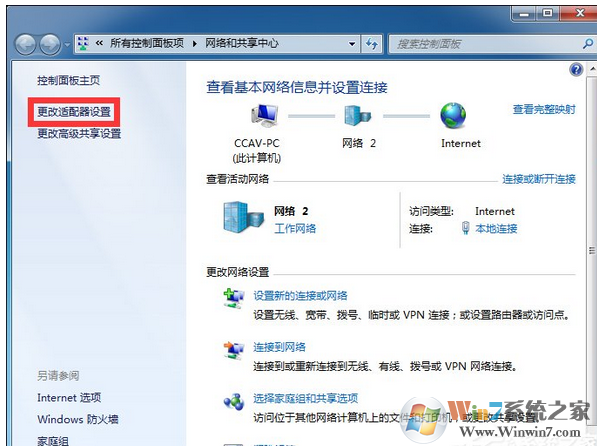 2、在打开的窗口中,点击“更改适配器设置”按钮。