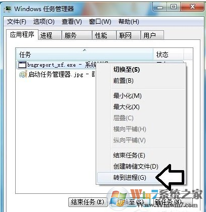 3、应用程序中可以看到bugreport_xf.exe可执行程序出错→右键点击转到进程。