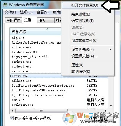 4、进程→右键点击csrss.exe→打开文件位置。