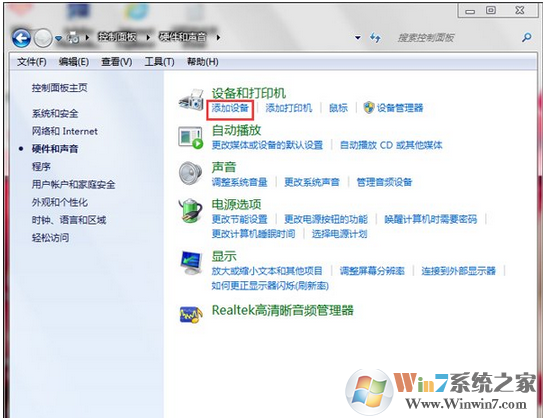 1、再开始里点击控制版面,点击【硬件和声音】找到【添加设备】如图: