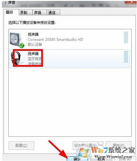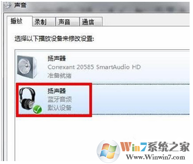 7、此时的默认播放设备是内置的扬声器,必须把蓝牙音频作为默认播放设备,才能使用蓝牙耳机听音乐 ,设置完成后,就可用蓝牙耳机听电脑播放的音乐了。