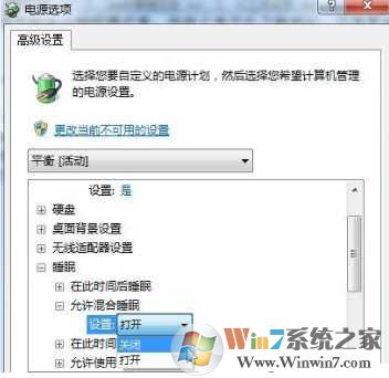 在控制面板,硬件和声音,然后电源选项,在你当前的电源计划上,选择更改计划设置,弹出的对话框后,再选择更改高级电源设置,弹出的对话框中找到睡眠,然后点击下拉,再点击允许混合睡眠,默认的设置是开启,你只需要更改成关闭,然后应用 确定,再试试你的系统能否睡眠了。