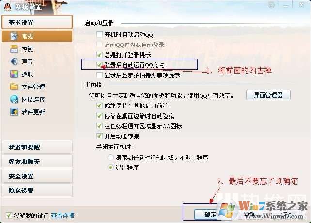 首先进入QQ设置如上图,点击底部的QQ设置图标后,之后就会弹出QQ设置对话框,然后在左侧常规设置中即可找到有登录QQ自动运行QQ宠物,我们把前面的勾去掉,再点底部的确定保存退出即可,如下图