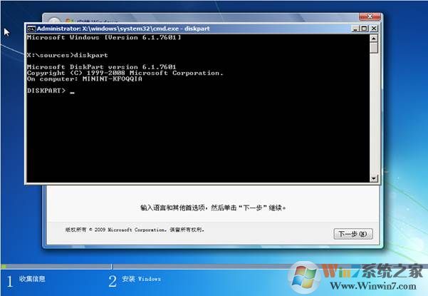 1、进入到Win7安装界面,如下图,按下键盘上“Shift”键+“F10”键或Shift”键+“Fn”键+“F10”键。启动CMD命令行模式窗口: