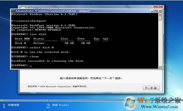 6、输入“clean”命令并按下“回车”键来请除您笔记本的硬盘中的所有分区及数据: