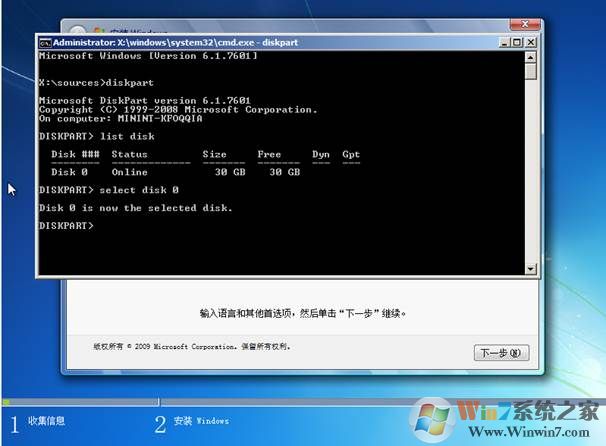 5、输入“S E L E C T disk 0”命令并按下“回车”键来选择您笔记本中的硬盘: