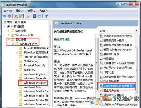2、运行gpedit.msc组策略里,计算机配置--管理模板--windows组件--windowsInstaller--启用关闭创建系统还
