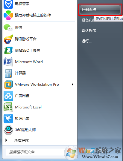 1、点击电脑左下角的开始图标,然后在打开的开始菜单中选择“控制面板”,打开控制面板程序。