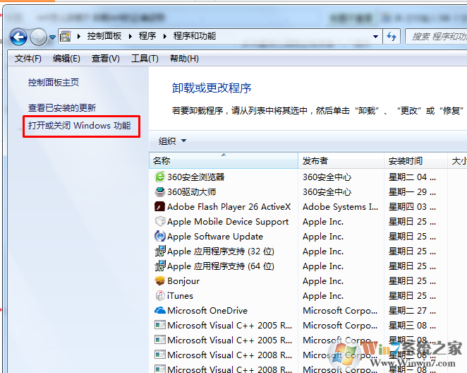3、打开的程序和功能默认位于卸载和更改程序页面中,在右下方我们可以卸载我们自己安装的程序,但是微软自带的程序在这里是找不到的,请继续看下面的说明,点击右边列表中的“打开或关闭Windows功能”。