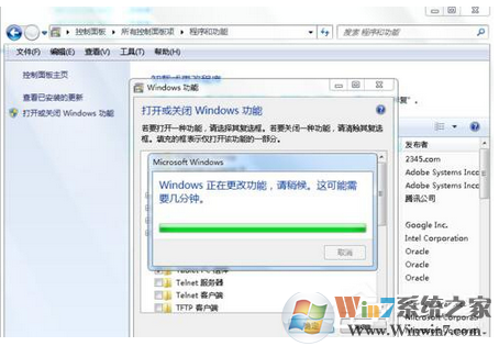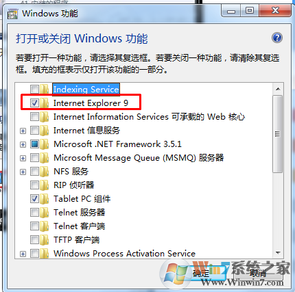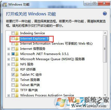 4、点击“打开或关闭Windows功能”后,就打开如下图所示的Windows功能对话框,在上面我们可以看到IE9。