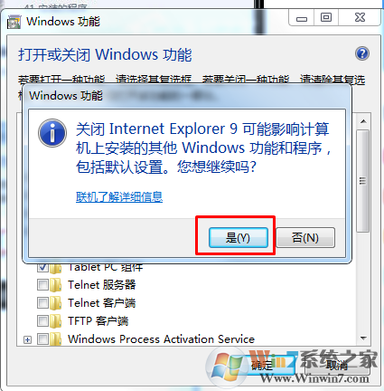 5、点击IE9前面的勾选,去掉勾选,点击后会弹出如下所示的提示框,其实并没有这个警告信息说的那么严重,只要我们安装了别的浏览器,就可以不用IE浏览器了,所以就直接点击对话框上面点按钮“是”。