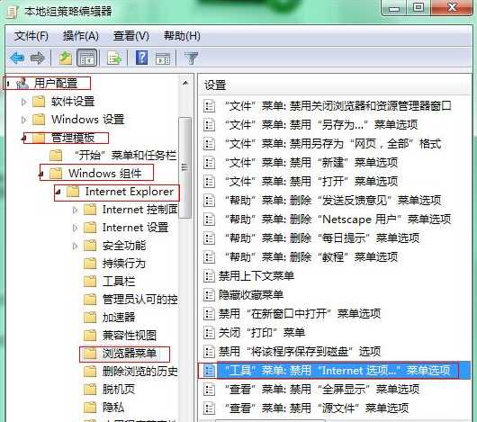 3、在【浏览器菜单】右侧选项列表中找到 “工具”菜单:禁用“Internet选项..”菜单选项,并双击打开;