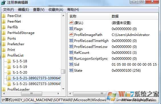 6.在ProfileList文件夹下,分别点击名字为较长的字符串的文件夹,查看窗口右侧的ProfileImagePath键的内容,找到路径为C:\Users\A的键。