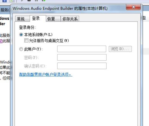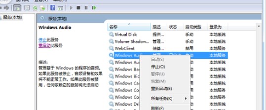2、点击“开始”菜单——》选择“所有程序”——》打开“管理工具”文件夹——》单击“服务”——》在服务窗口中找到“windows audio,接着鼠标右键点击“windows audio”服务,选择“属性”——》然后切换到“登录”选项卡中——》先将“登录选项”设置为“本地系统帐户”,点击一次“应用”—— 》再重新将“登录选项”设置为“指定账户”,下方选择“local service”账户——》点击“确定”退出后,重新启动计算机即可