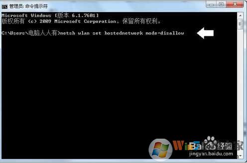 在命令提示符窗口输入:netsh wlan set hostednetwork mode=disallow 按回车(Enter键)执行命令。