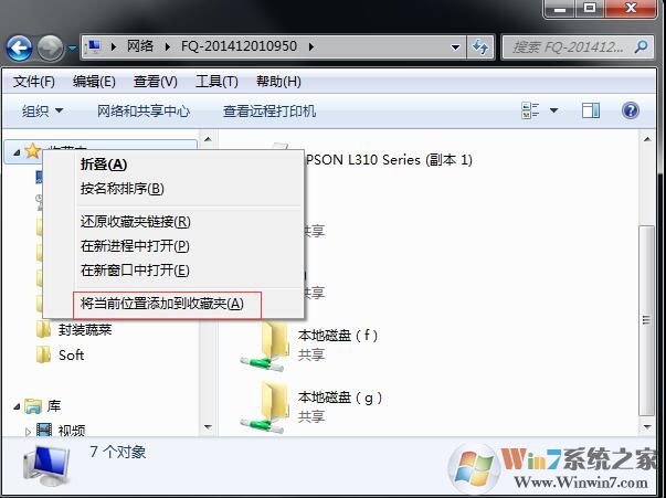 4、打开目标共享计算机后,右链点击左侧的收藏夹,然后选择“将当前位置添加到收藏夹”;