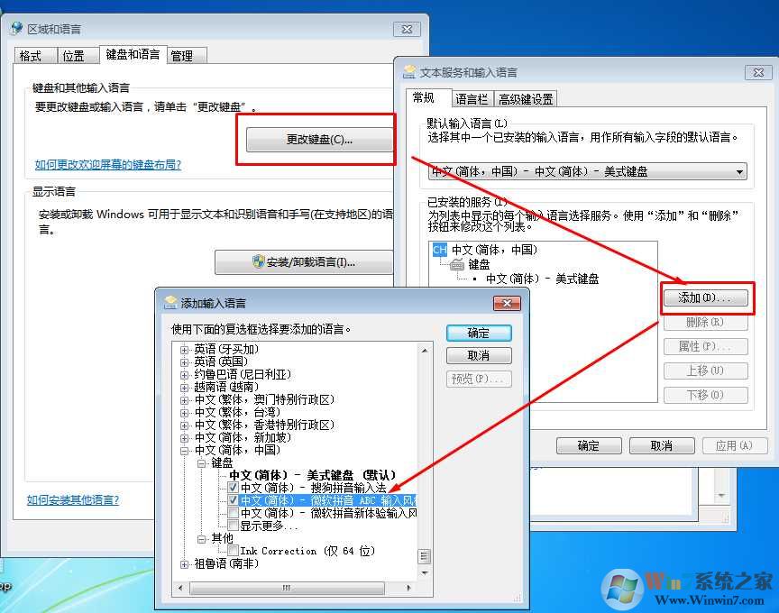 打开控制面板——》点击“更改键盘或其他输入法”——》更改键盘——添加一个中文输入法!