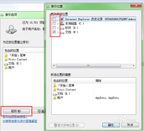 3、在索引选项里点击【修改】,然后把要查找的文档可能在的位置都勾选上,点击确定保存。
