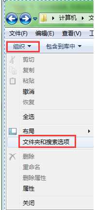 4、之后打开我的电脑任意窗口,在左侧找到【组织】一项,点击倒三角,选择【文件夹和搜索选项】