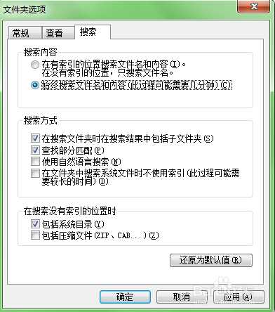5、在“文件夹和搜索选项”对话框中,点击搜索标签,在【搜索内容】一栏中,选中“始终搜索文件名和内容(此过程可能需要几分钟)”,之后点【确定】保存