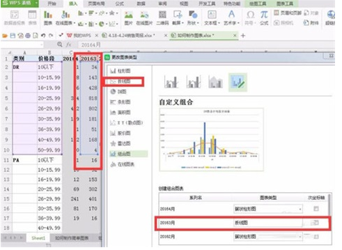 5、我在这里就选折线图来呈现我们刚刚选的20163月的数据为第2种图形,在原来柱形图上选中数据右击鼠标选更改图表类型这一项将3月的改为折线图,如图所示