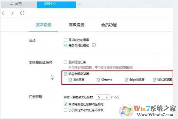 2、在打开的“基本设置”界面当中,把“相应全部内部浏览器”的勾选去掉,就可以使用浏览器来下载了,如果我们勾选这个选项的话,那么就是默认使用迅雷进行下载。如图所示: