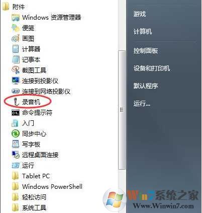 1、点击开始菜单——所有程序——附件——“录音机”;