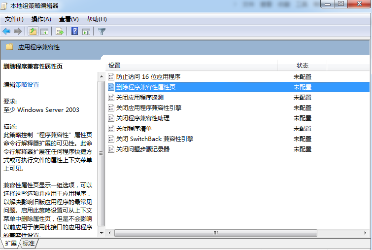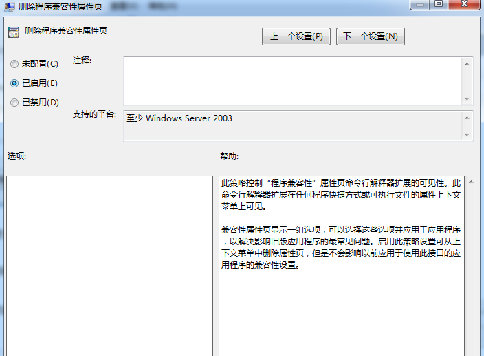 3、然后我们可以在右侧窗口看到“删除程序兼容性属性页”的一项,双击该项,我们可以看到该项是启动设置状态,我们设置为“禁用”或者“未配置”都可以。