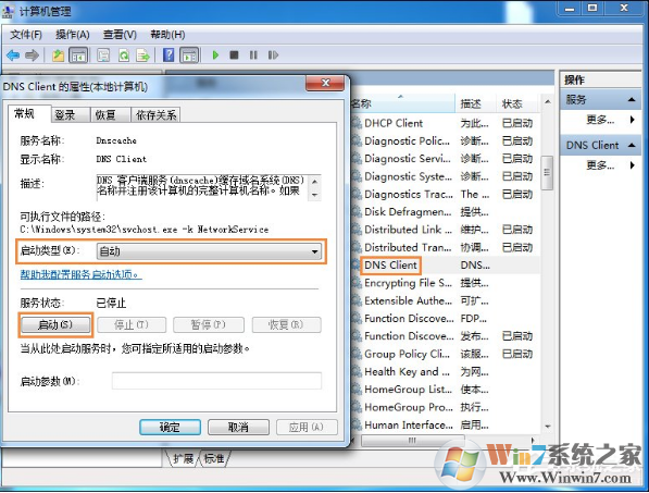 3、在右侧启动“DNS Client”服务即可,最好将该服务双击打开,将其启动类型设为“自动”,并点击“服务状态”下的“启动”即可。如图所示: