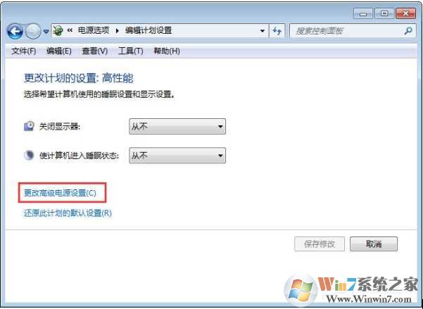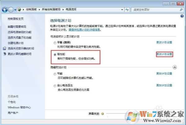 1、首先打开Windows7控制面板 - 电源管理选项 - 高性能 - 更改计划设置。