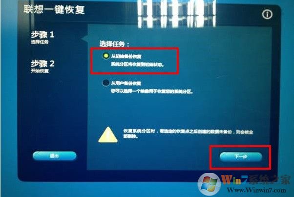 通过上下箭头选择“system recovery”,回车后进入一键恢复页面,默认选择从初始备份恢复,直接点击“下一步”