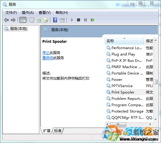 2、打开Win7系统的服务列表后,我们在右侧窗口中寻找 PrintSpooler服务,快捷的方法为选中任何一个服务并按“P”键系统会自动定位到以P开头的服务;