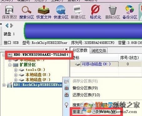 5、当然,我们也可以利用“DiskGenius分区工具”对引导分区进行修复。在其程序主界面中,右击要修复的分区,从弹出的右键菜单中选择“重建主引导记录”项进行修复。