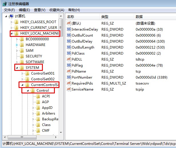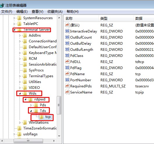 2、打开注册表后,我们展开键项HKEY_LOCAL_MACHINE\SYSTEM\CurrentControlSet\Control\Terminal Server\Wds\rdpwd\Tds\tcp 注意层次非常多,大家别找错了。