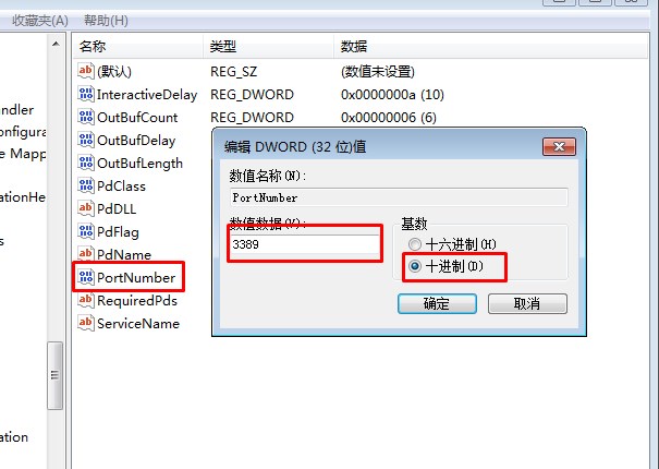 3、选取TCP键项后,然后双击右侧窗口中的,PoPortNumber 项,该项就是记录远程端口号的子键,打开后我们选择十进制,数值d3d就会变成3389,这时我们把它更改为 3396,或者别的数值,最重要的是不要跟别的程序端口冲突;如下图