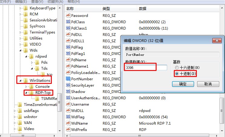 4、我们还需要在注册表里更改一处地方,在键项WDS下面的Winstations\RDP-TCP中右侧窗口中找到PortNumber,依然改成3396 记住跟上面一样就可以了。