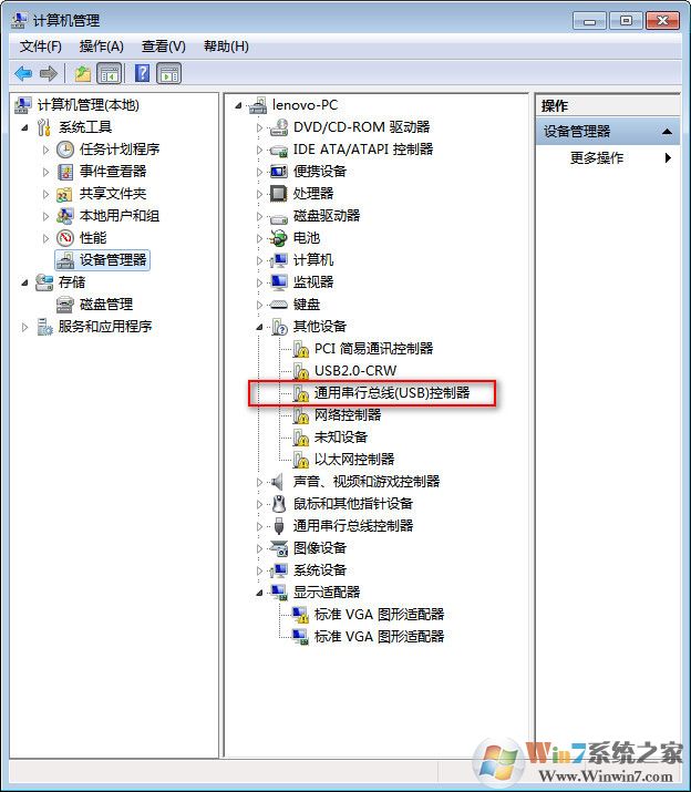 2、在Windows 7系统安装完毕后,可以在设备管理器中看到未安装的设备,图中红框的即是USB3.0设备。