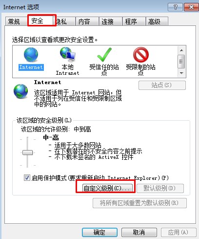 2、点击安全标签切换到安全页面,并点击【自定义级别】按钮,看下面图片;