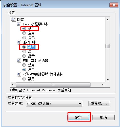 3.将滚动条下拉,将“java小程序脚本”和“活动脚本”勾选为“禁用”,点击“确定”按钮保存退出,如下图所示。