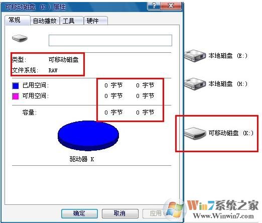 情况一:一块移动硬盘,文件系统显示为RAW文件系统,总共字节为0,可用字节为0。