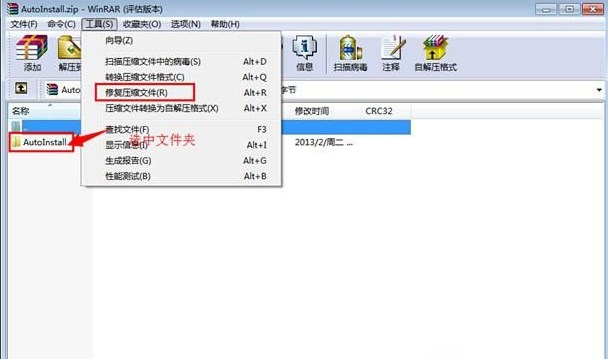 1、在需要修复的winRAR文件上双击,在打开的窗口中选中需要修复的文件夹,选择“工具”—“修复压缩文件”命令。