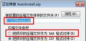 2、此时会弹出“正在修复”窗口.选择保存的位置,并选中“把损坏的压缩文件作为RAR格式对待”的单选按钮,点击“确定”按钮进行修复。