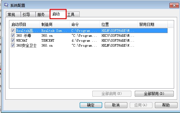 3.咱们再次打开win7旗舰版电脑的运行窗口,然后在其中输入msconfig并单击回车,在打开的系统配置窗口中,咱们将界面切换到启动这一栏,然后在其中找到soundmax.dll相关的启动项,将这些启动项前面的勾选去掉,然后点击设置保存就可以了。(因为小编的电脑没有出现这个问题,所以相关的文件和启动项会找不到,大家自己找一下)