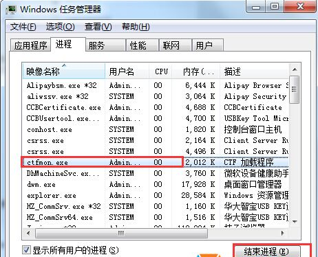 2、切换到进程选项卡页,在进程中找到ctfmon.exe 选择并结束该进程;